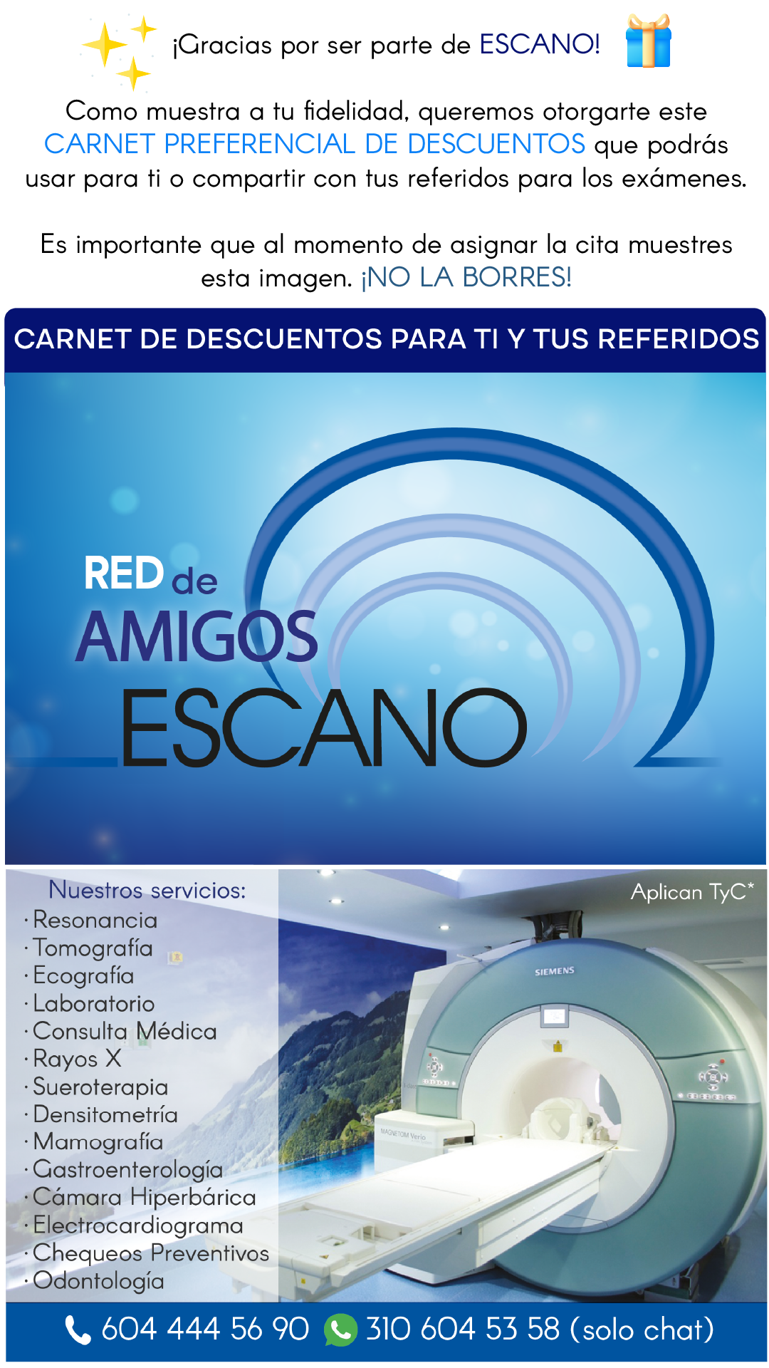 ¿Sabes que es “Red de Amigos Escano”? Son las personas que portan este carnet digital con el fin de recibir descuentos en los exámenes. Puedes compartirlo con quien quieras. Es importante que a la hora de agendar tu cita, muestres esta tarjeta. Descárgala dando clic aquí.